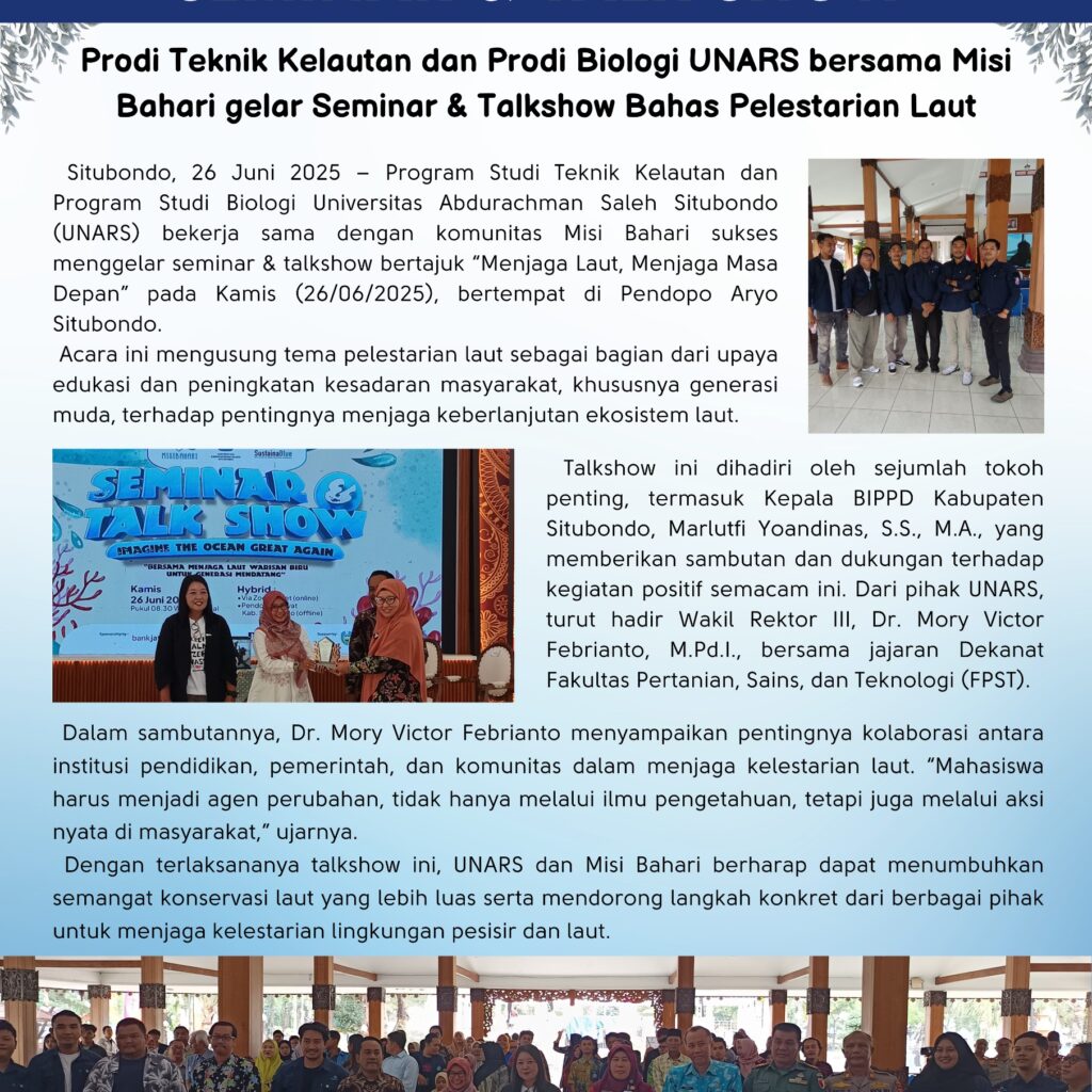 26 Jun 2025 Admin Kelautan 0 Comments SEMINAR DAN TALK SHOW PRODI TEKNIK KELAUTAN BERSAMA MISI BAHARI DI PENDOPO RAKYAT SITUBONDO